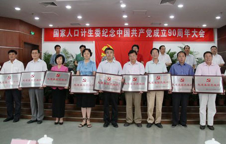 6月27日,国家人口计生委召开纪念中国共产党成立90周年大会,表彰了在创先争优活动中涌现出的12个先进基层党组织、99名优秀共产党员、13名优秀党务工作者、3个党风廉政建设先进单位和20名廉洁自律先进个人。 中国计生协国内工作部党支部为先进基层党组织,王景水、李扬、朱扶庭、魏瑞亮、杜莉莉、孙政深、李晓玉、孙明、苏英、赵宜洲10名同志为优秀共产党员,吴光华同志为优秀党务工作者,樊艳华同志为廉洁自律先进个人,在大会上受到了表彰。